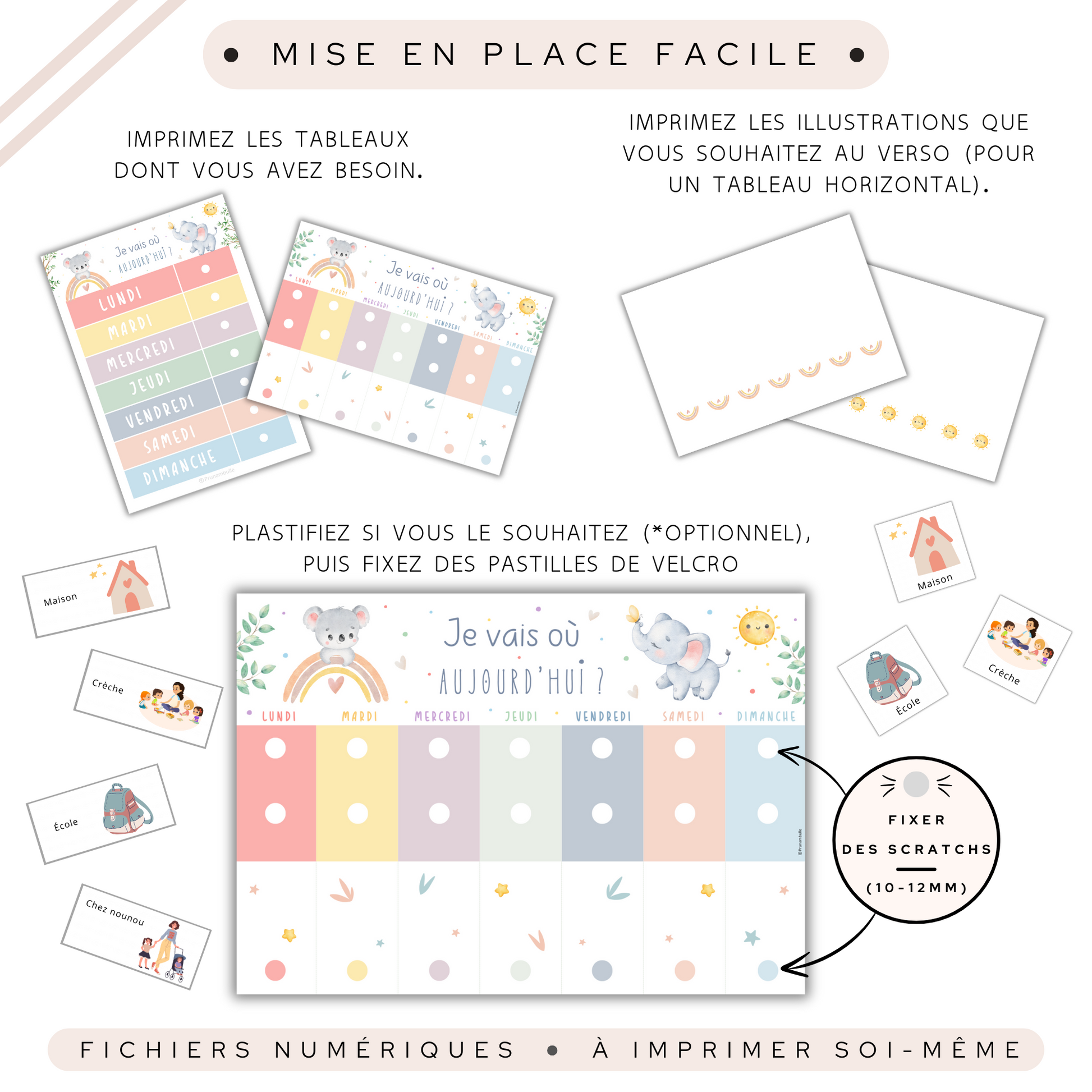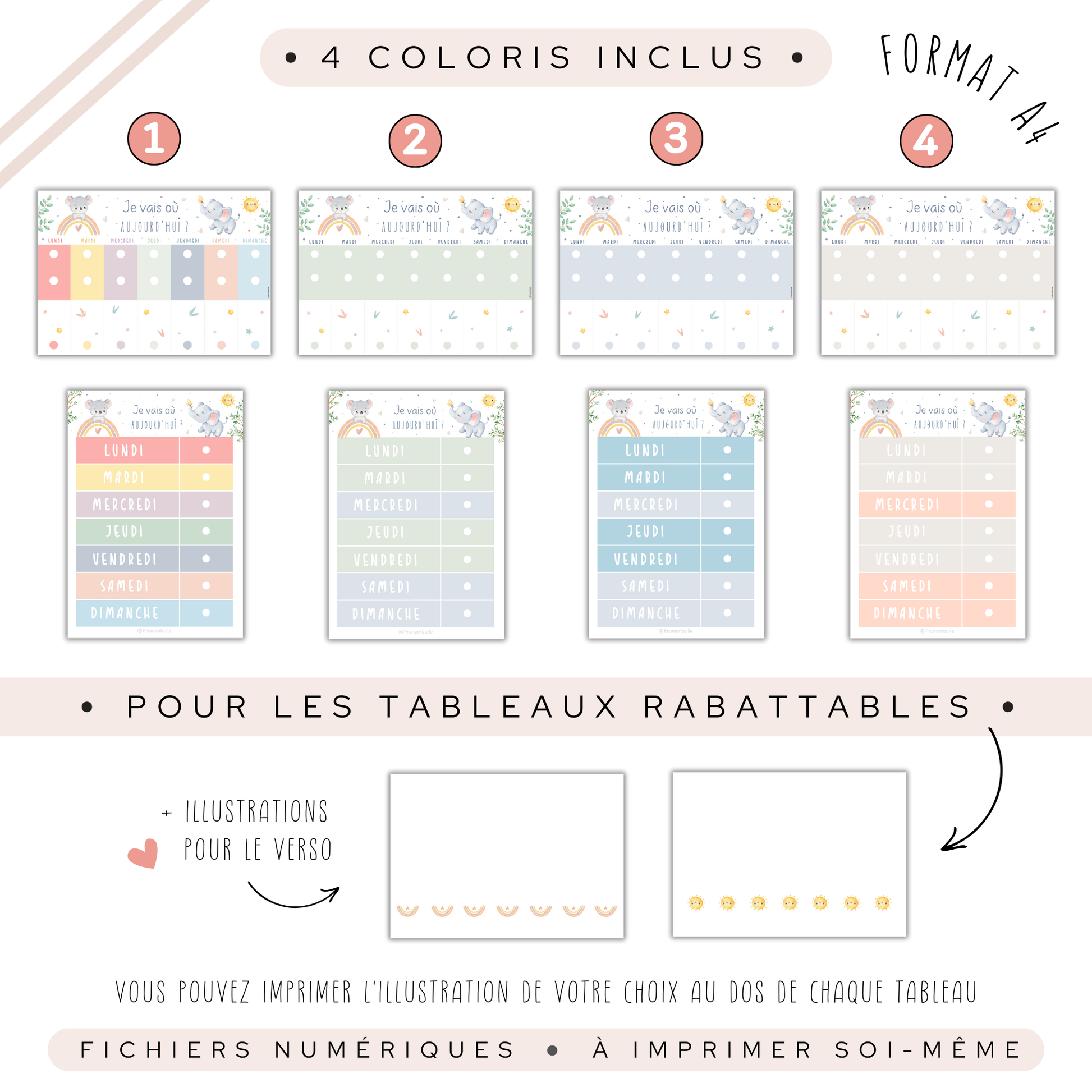 À toi, super parent, qui cherches une solution pratique et fun pour aider ton enfant à se repérer dans sa semaine, ce kit de 2 tableaux est pile ce qu'il te faut ! Pensé pour les petits de maternelle, les enfants avec TSA ou simplement pour tous ceux qui adorent les visuels ludiques, ce kit associe douceur des couleurs pastel et charme des koalas et éléphants 🤩.