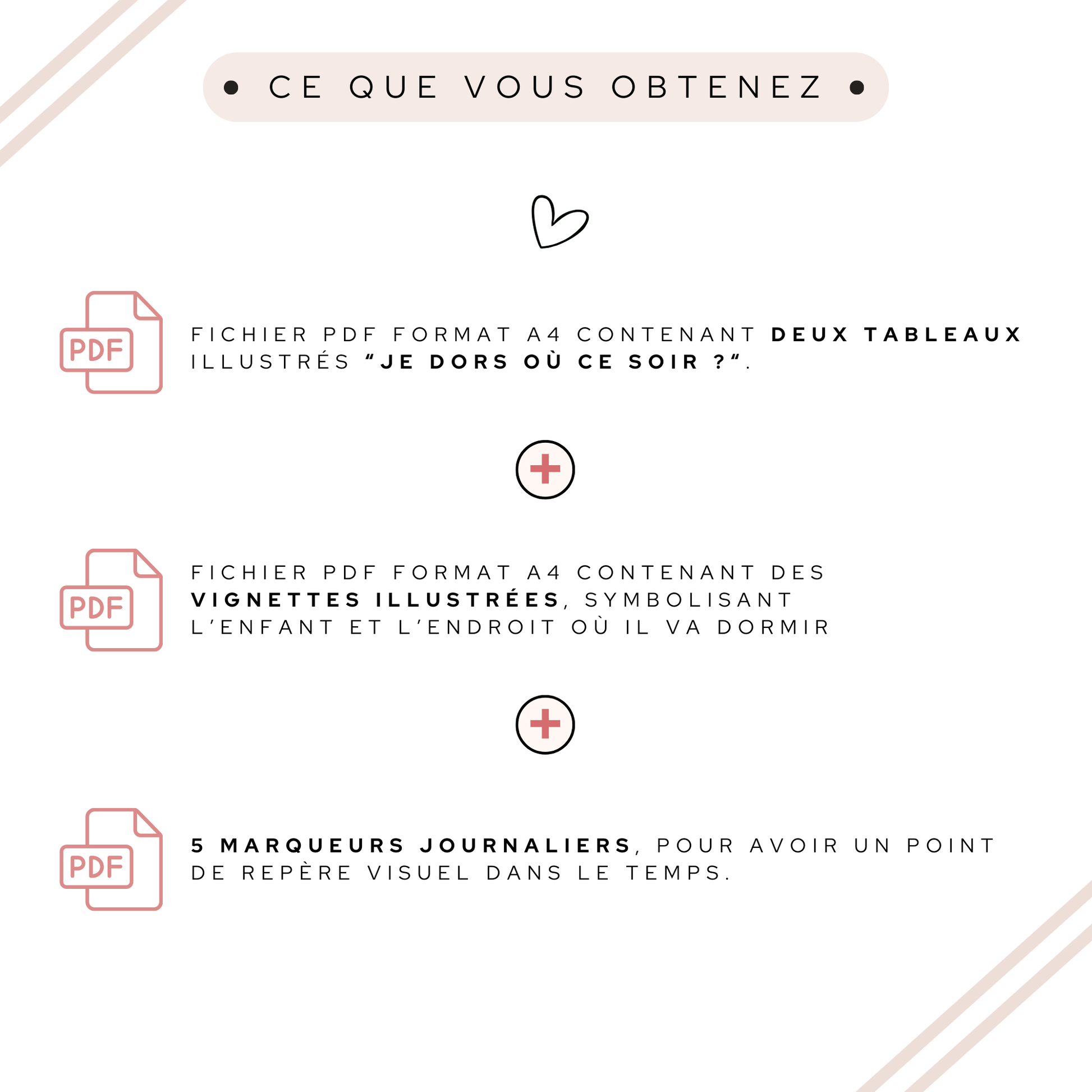 Simple, beau et bien pensé. Mon fils était angoissé par les changements de maison, maintenant il se sent acteur de sa semaine. Le tableau "Je dors où ce soir" nous a clairement aidés à apaiser les transitions.