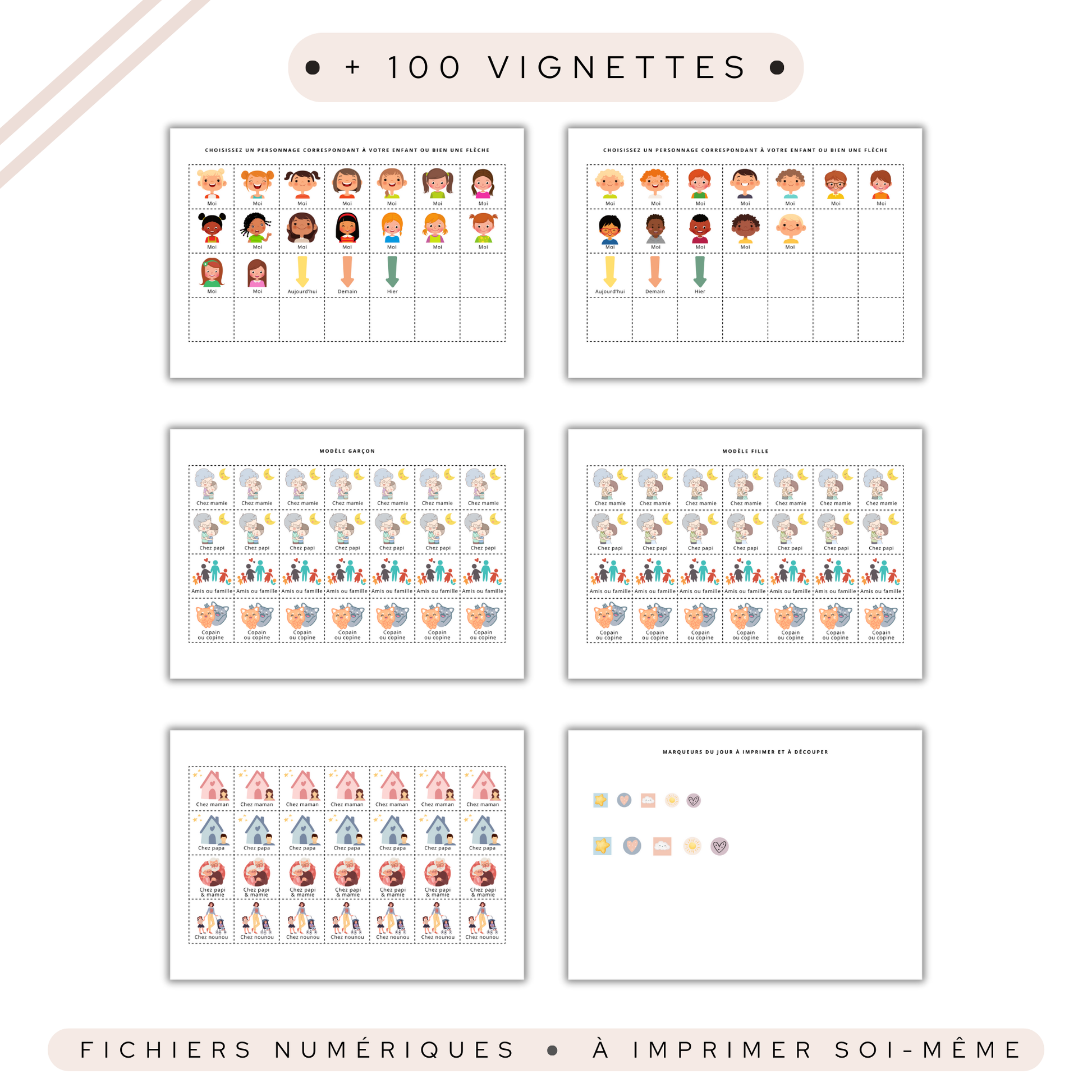 Le kit comprend deux semainiers téléchargeables à imprimer soi-même 📥. Chaque tableau est conçu pour faciliter la gestion de la garde alternée et permettre à ton enfant de mieux comprendre où il va être chaque jour de la semaine. Mais ce n’est pas tout : il y a plus de 100 vignettes pour personnaliser les tableaux à l'infini ! 🎨 De quoi faire en sorte que chaque moment soit plus doux et plus joyeux. Les tableaux sont organisés de manière simple et claire, et chaque section a un petit pictogramme pour rendre les informations encore plus faciles à comprendre.