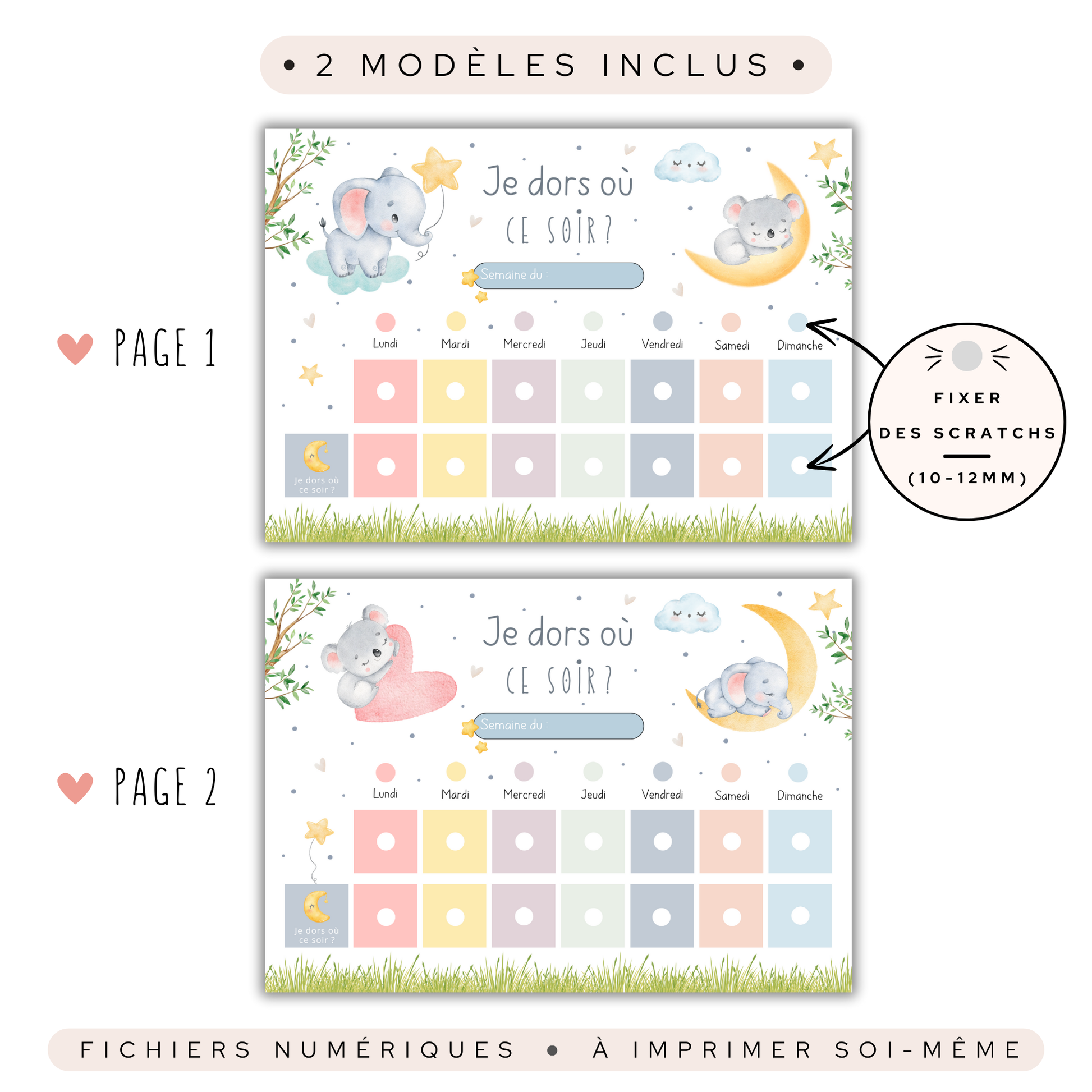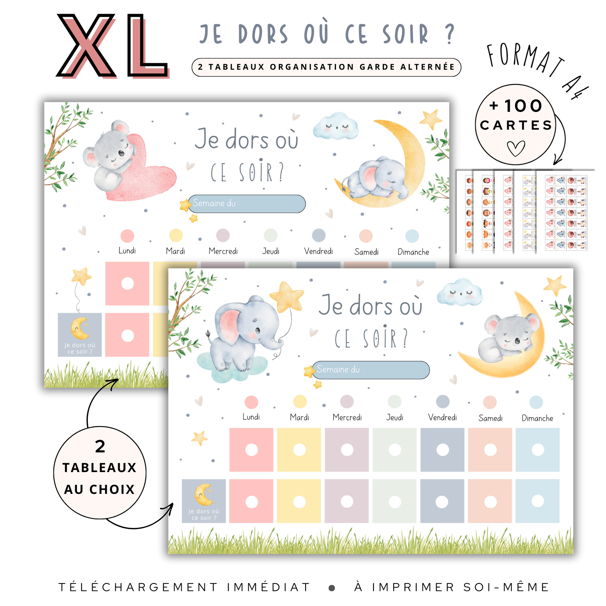 T’es à la recherche d’un moyen fun et hyper pratique pour aider ton petit bout à mieux comprendre et anticiper les journées en garde alternée ? Ce kit de 2 tableaux de garde alternée, avec son design tout doux aux couleurs pastel, est là pour te faciliter la vie à toi, mais aussi à ton enfant ! Ces semainiers (du lundi au dimanche) sont parfaits pour structurer ses journées et l’aider à visualiser où il va passer son temps chaque semaine, avec des personnages adorables de koalas et d’éléphants. 🌈
