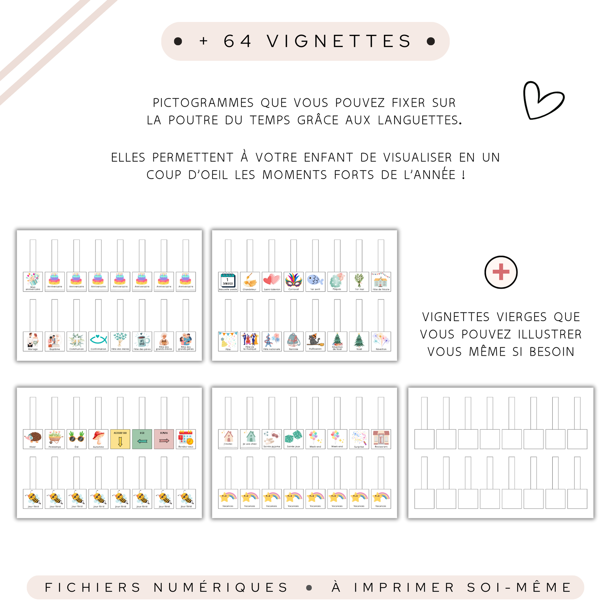 - 64 vignettes illustrées : Des images représentant des moments clés de l'année (Noël, anniversaires, fêtes des mères, etc.) sont fournies. En les fixant sur la poutre, ton enfant peut visualiser d'un coup d'œil les événements à venir.
