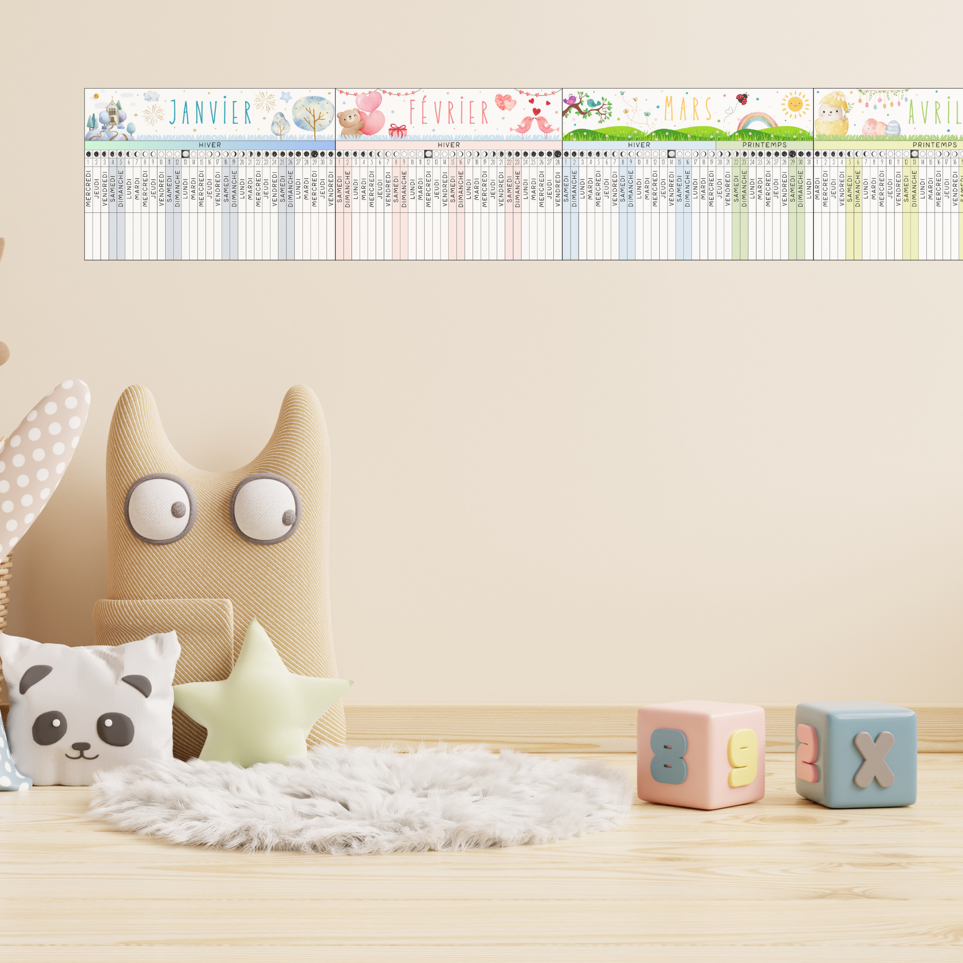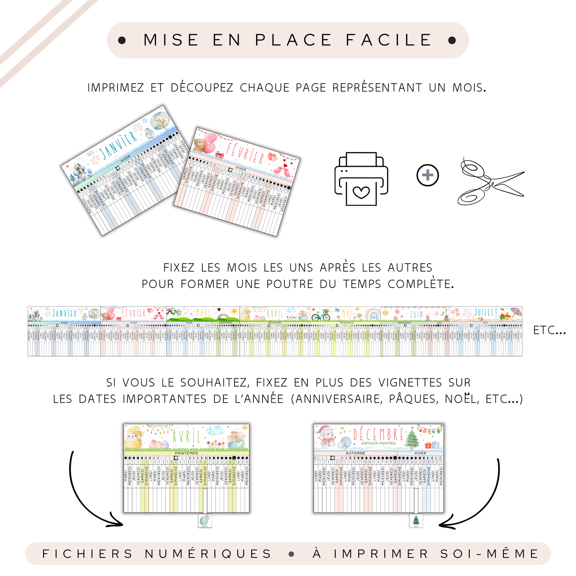 Assemblage : Colle les pages mensuelles bout à bout pour créer une longue frise. Tu peux l'afficher sur un mur dans la chambre de ton enfant ou la salle de jeux par exemple !