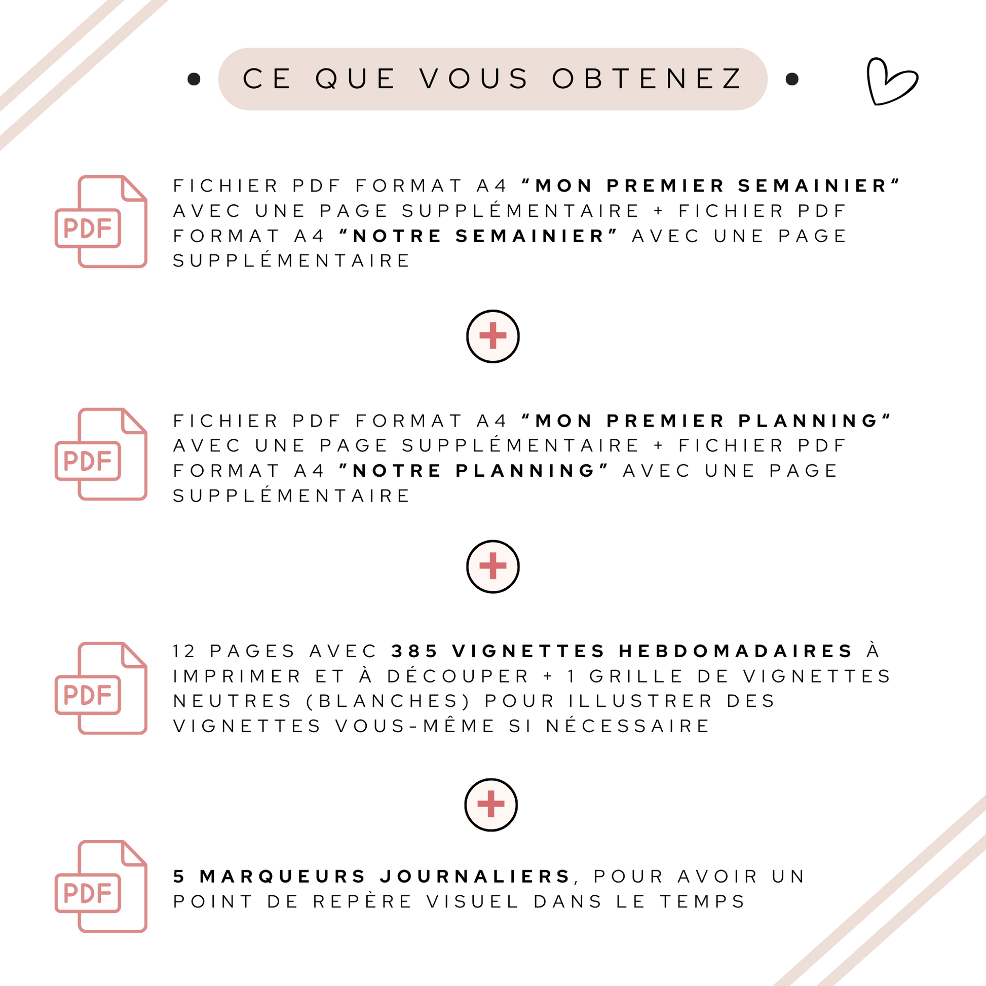 Chaque enfant et chaque famille est unique. C'est pourquoi notre semainier est entièrement personnalisable. Besoin de plus d'espace pour une journée chargée ? Imprime simplement une page supplémentaire et ajoute-la au tableau. Ton enfant a une activité spécifique qui n'est pas représentée ? Pas de souci, des vignettes vierges sont incluses pour que tu puisses les personnaliser selon vos besoins.