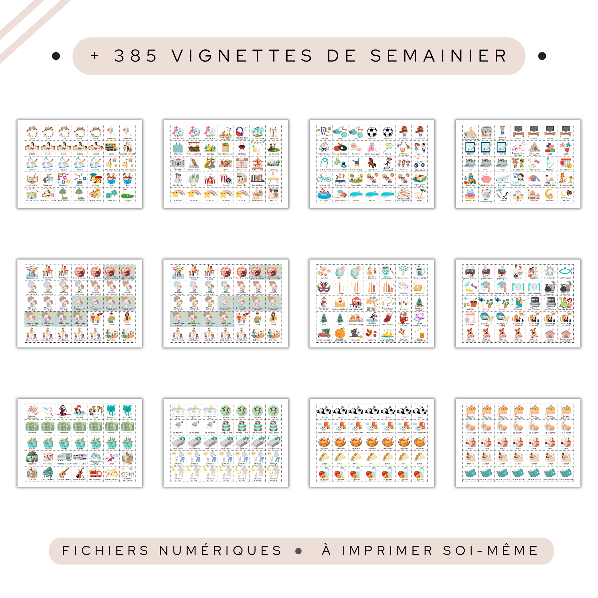 - 385 pictogrammes illustrés représentant diverses activités et événements, comme "crèche", "école", "coiffeur", "jouer dehors", etc.