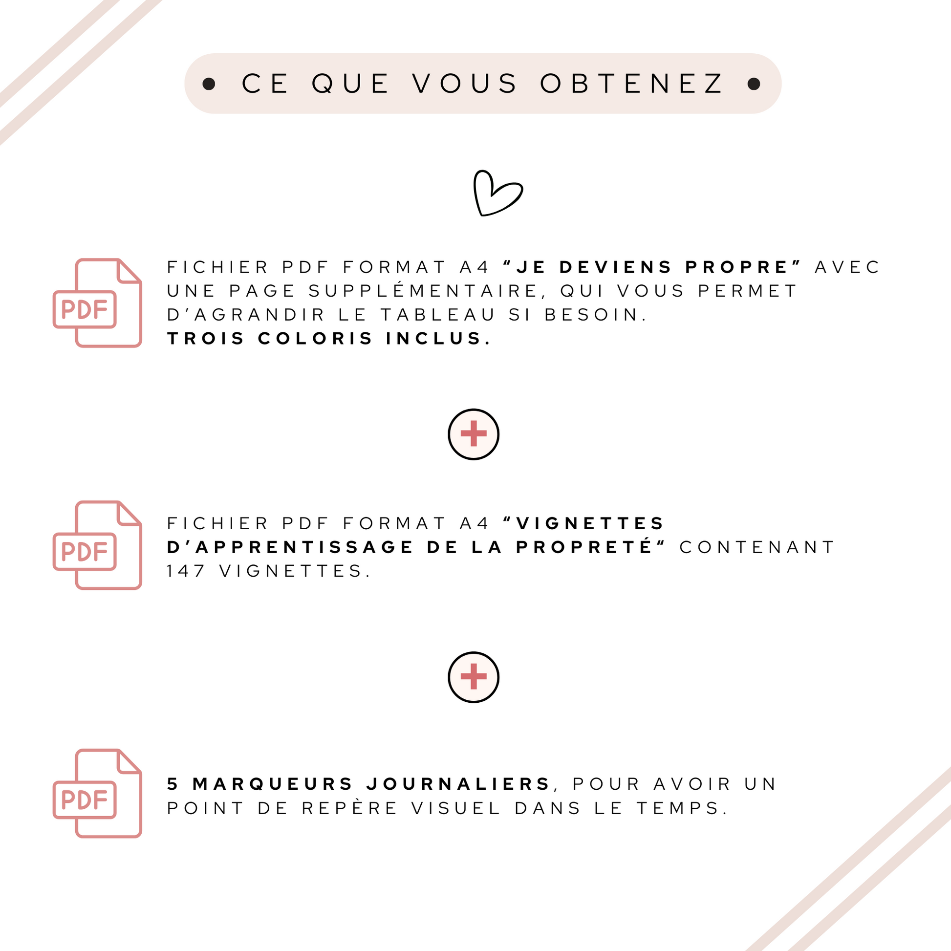 Dans ce kit, tu trouveras tout ce qu’il te faut pour instaurer une routine de propreté positive et sereine. Inspiré de la méthode Montessori, ce tableau ne repose pas sur le principe de la récompense mais sur l’envie naturelle de ton enfant de grandir et de s’impliquer. Voici ce qu’il contient :