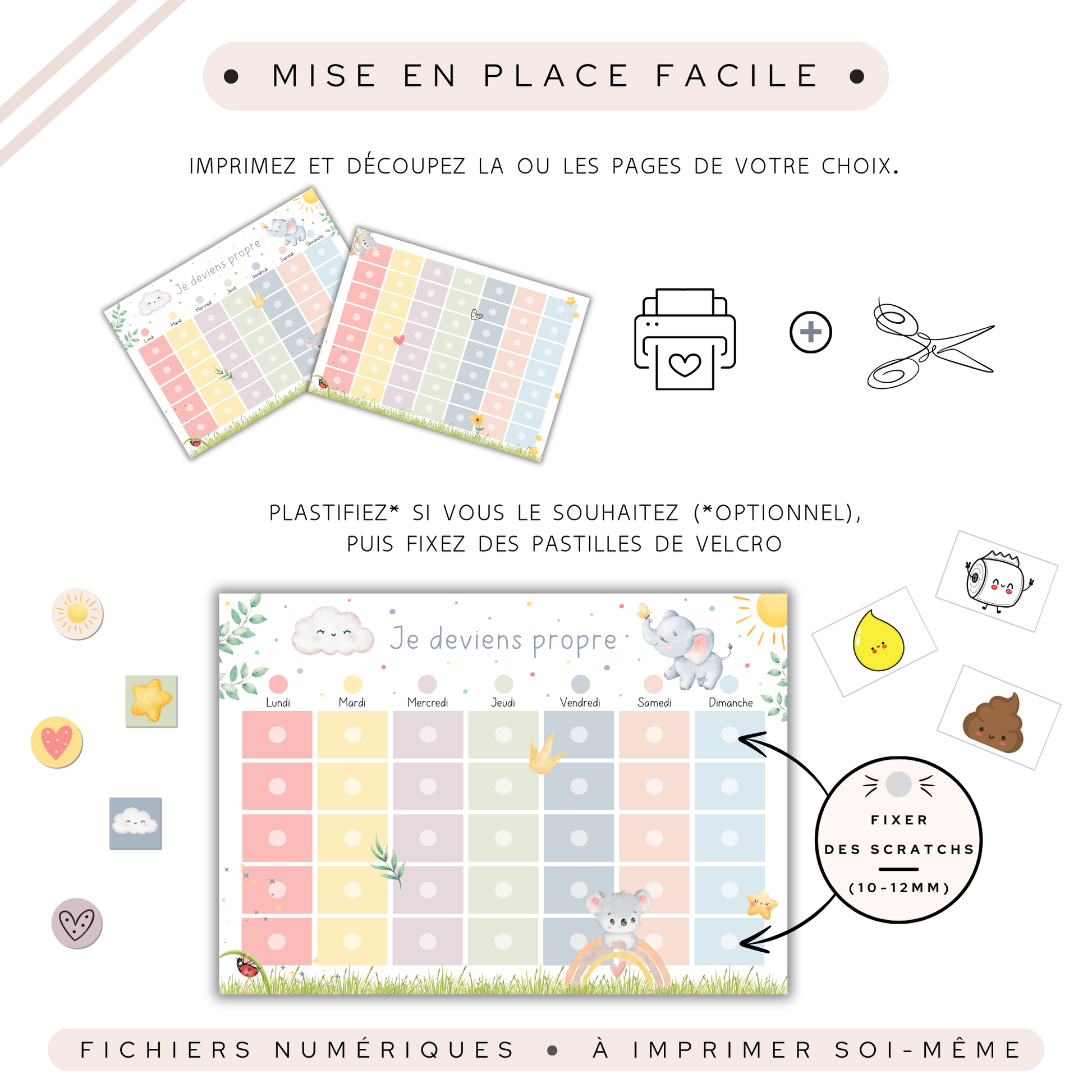 Tu veux aider ton enfant à devenir propre tout en transformant cette étape en une aventure douce et ludique ? Laisse-moi te présenter notre tableau de propreté à télécharger et imprimer toi-même : un outil à la fois pratique, fun et esthétique, parfaitement adapté aux petits apprentis de la propreté !
