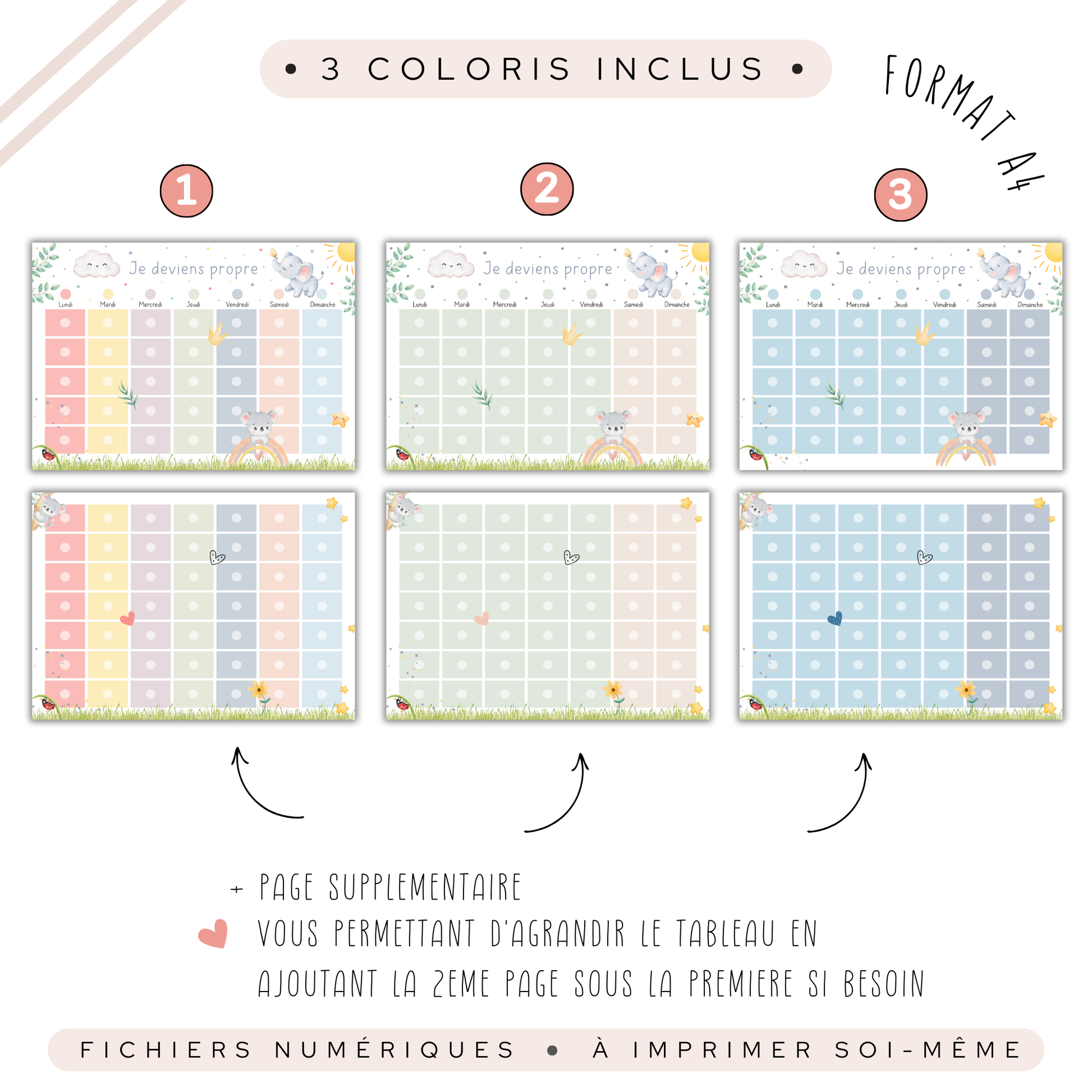 - 1 tableau hebdomadaire (du lundi au dimanche) décliné sur le thème des koalas et des éléphants pastel, dans trois couleurs au choix (rose tendre, bleu doux, et vert apaisant).