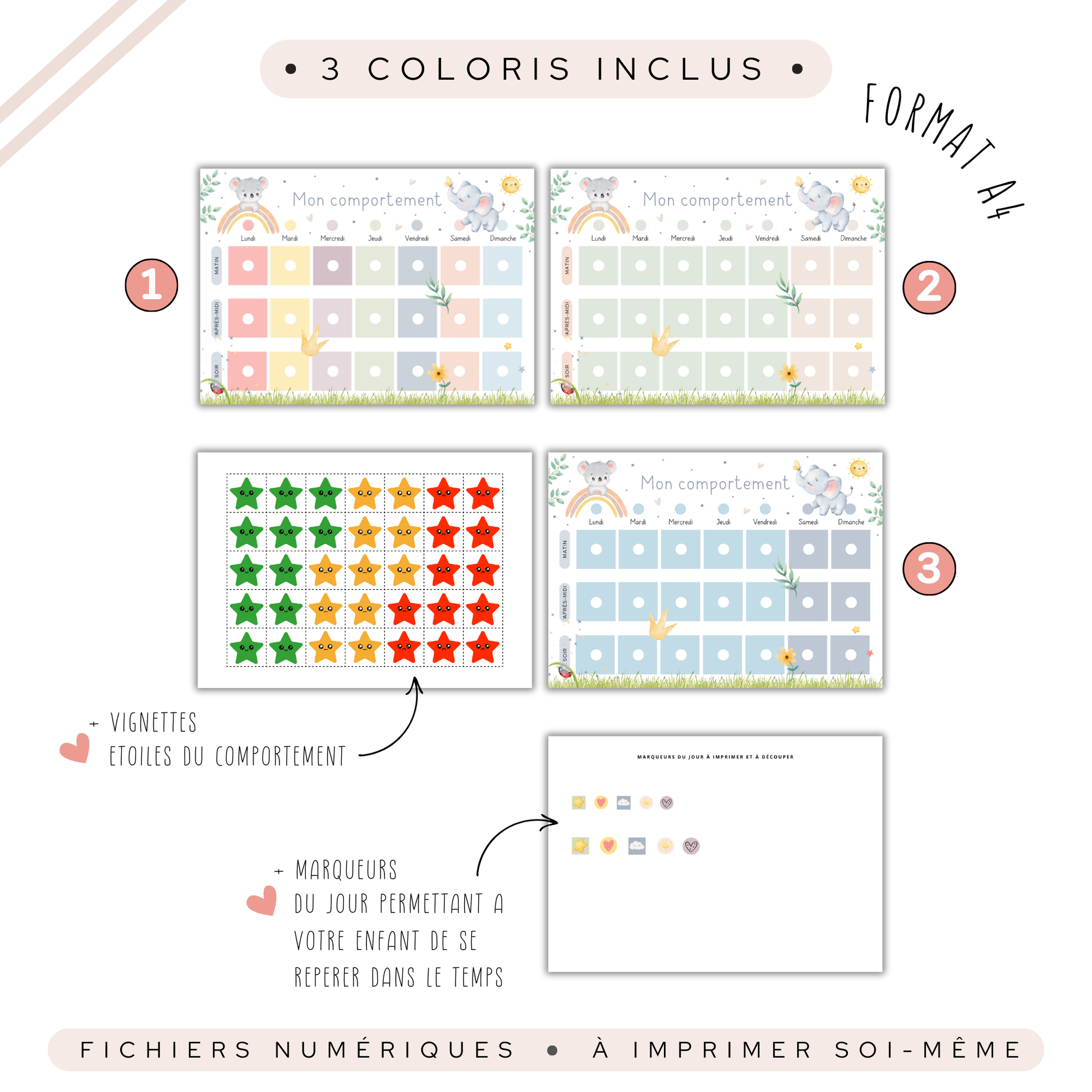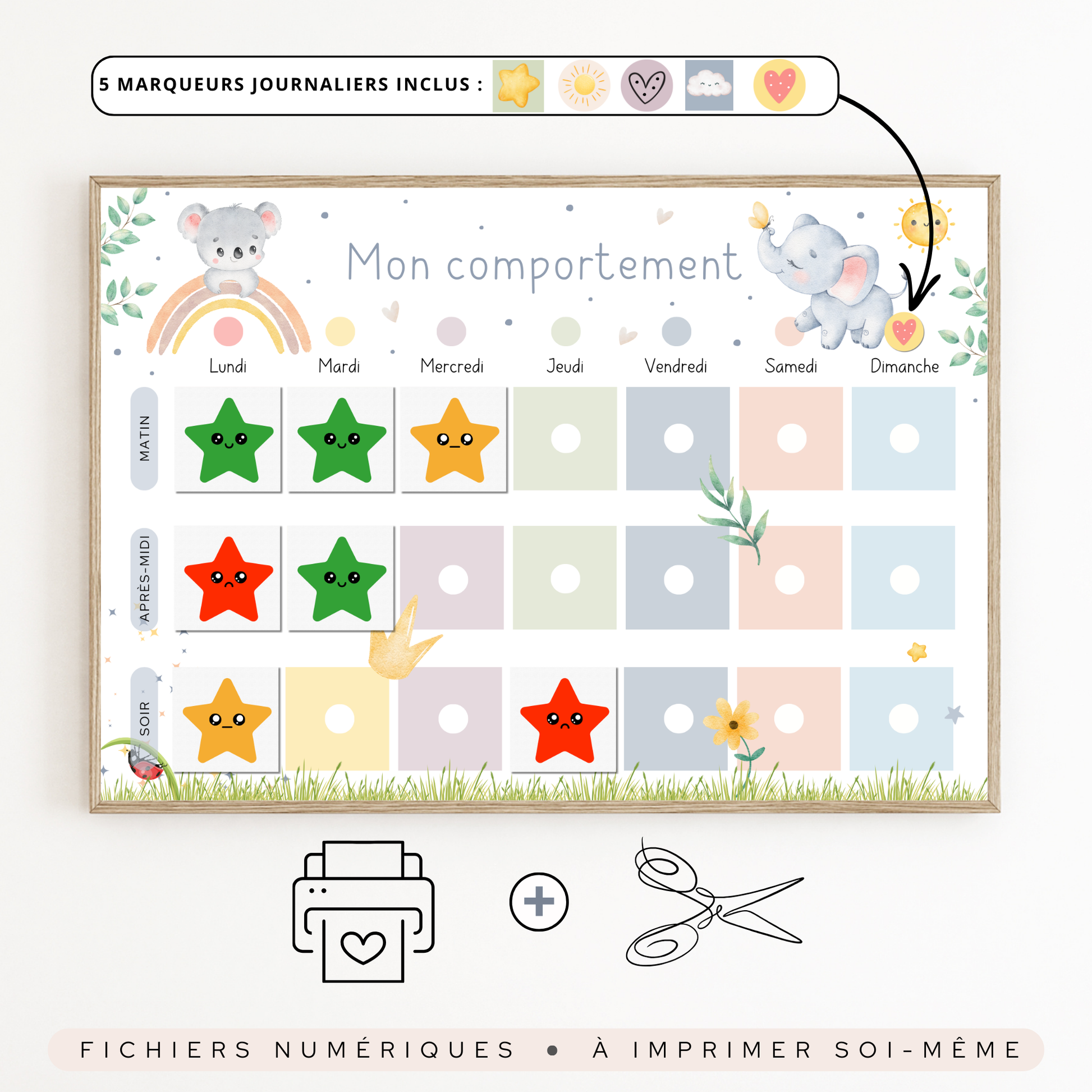 Tu cherches une astuce sympa pour encourager ton enfant à adopter de bonnes habitudes tout en lui apprenant à se responsabiliser ? Voici le Tableau de Comportement thématique Koalas et Éléphants Pastel ! Inspiré de la méthode Montessori, ce kit à télécharger et imprimer est une solution visuelle et engageante pour accompagner les petits dans leur épanouissement. Prépare-toi à transformer le quotidien en une aventure amusante et bienveillante. 🌟